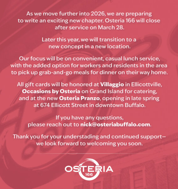 Make someone’s day by delivering an eGift card by email. The cards are good at Osteria 166, Villaggio (Ellicottville) and StockTheFreezer—making it the most versatile gift card around!